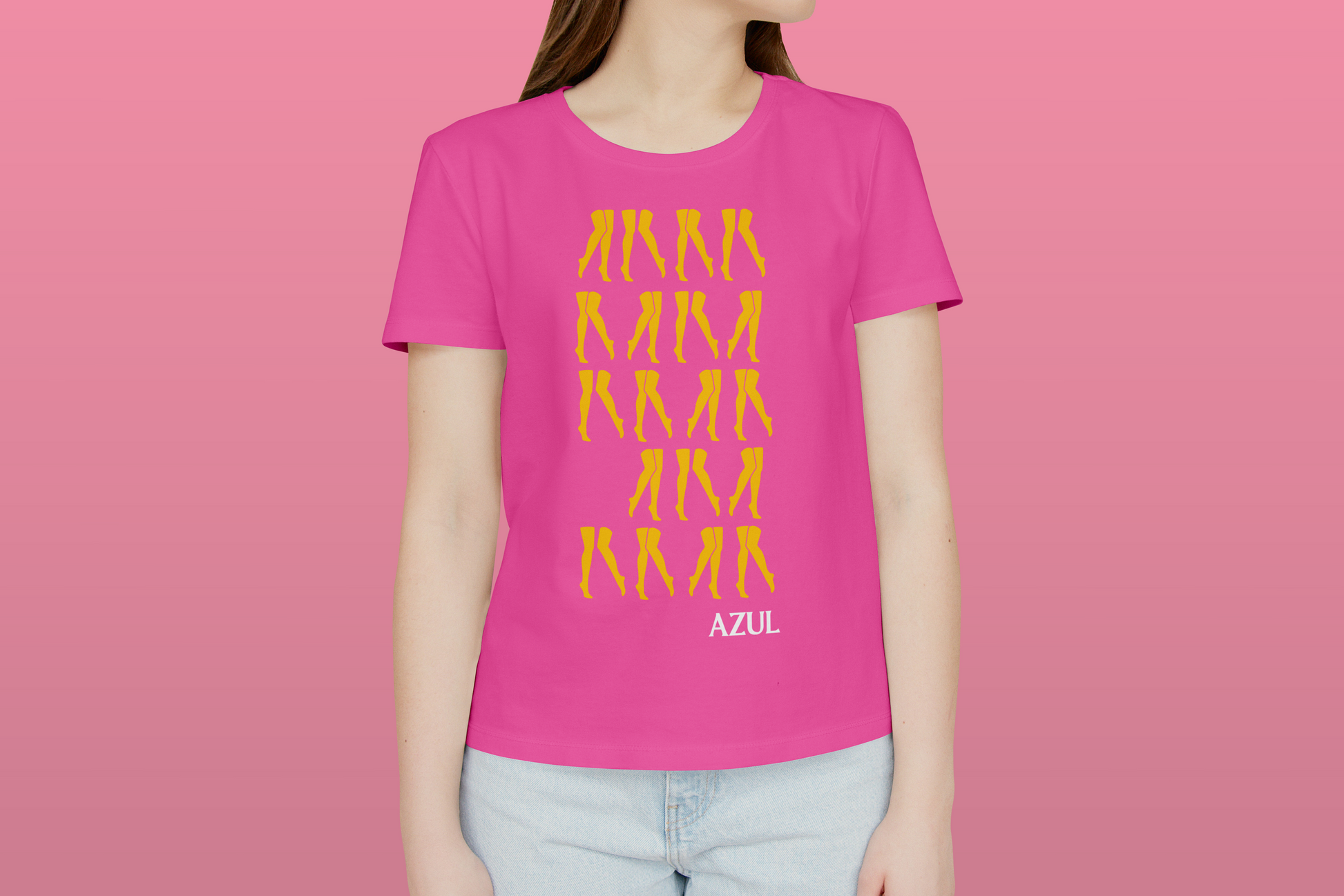 Pink unisex tee with columns and rows of yellow illustrated legs dancing with AZUL in white in the lower right corner.
